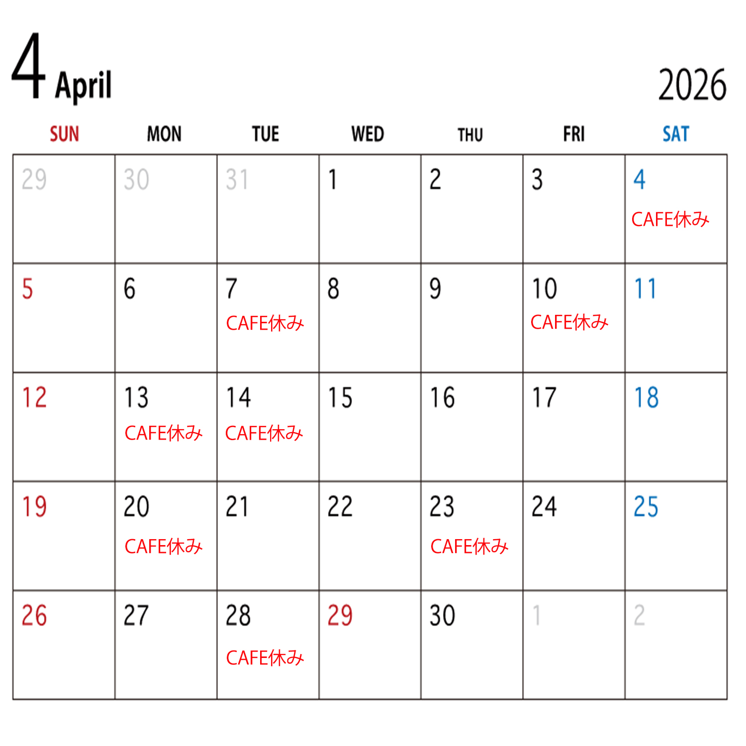 お休みはカレンダー赤文字の曜日となります。